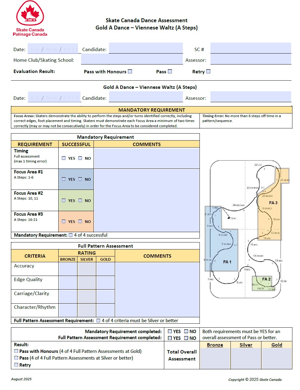 Ceci s’agit d’un dossier zip contenant toutes les feuilles d’évaluation de danse. Des instructions sont incluses à la fois pour le coordonnateur de l’évaluation et pour l’évaluateur/l’entraîneur-évaluateur pour une utilisation numérique (PDF remplissable) ou l’impression de copies papier. Les feuilles d’évaluation de la danse sont requises pour les évaluations par l’entraîneur évaluateur (STAR 1 à 5) et l’évaluateur (STAR 6 à Diamant). Les feuilles contiennent (1) une partie supérieure, pour le coordonnateur de l’évaluation, en vue de la soumission de l’évaluation et (2) une partie inférieure pour le patineur, à mettre dans son dossier d’évaluation. Étant donné que le verso des feuilles d’évaluation compte des renseignements pertinents, le recto et le verso doivent être fournis au patineur, à l’évaluateur ou à l’entraîneur-évaluateur.